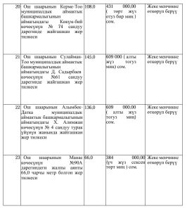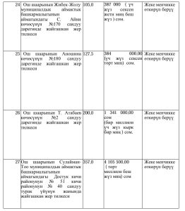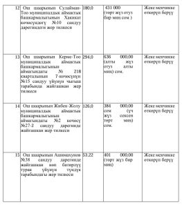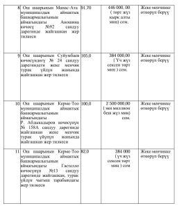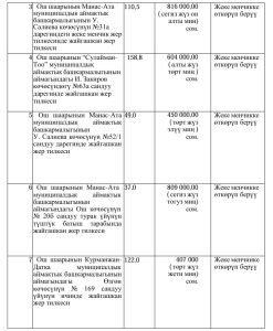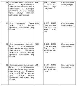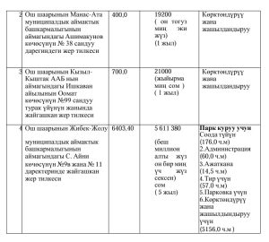 ✅ Ош шаарынын мэриясынын муниципалдык менчик башкармалыгы төмөндөгү даректердеги муниципалдык жер тилкелерин аукцион жолу менен жеке менчикке өткөрүп берүү берүү боюнча аукцион өткөрүүгө сынак жарыялайт: