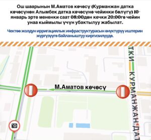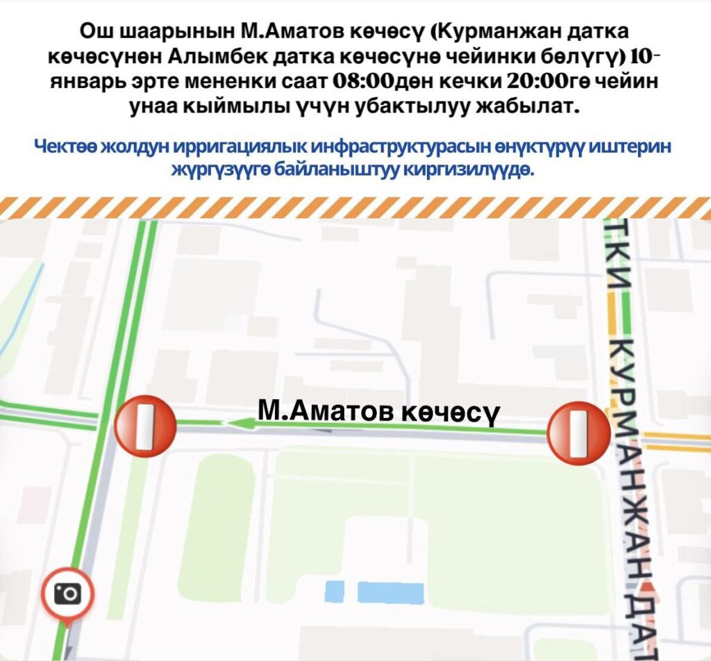 ✅ Ош шаарынын М.Аматов көчөсү (Курманжан датка көчөсүнөн Алымбек датка көчөсүнө чейинки бөлүгү) 10-январь эрте мененки саат 08:00дөн кечки 20:00гө чейин унаа кыймылы үчүн убактылуу жабылат.
