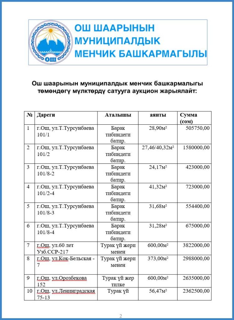 Аукционго катышуучулар Ош шаарынын мэриясынын муниципалдык менчик башкармалыгына (Ош шаары, Заднепровский көчөсү, №4) төмөнкү документтерди тапшыруулары зарыл: