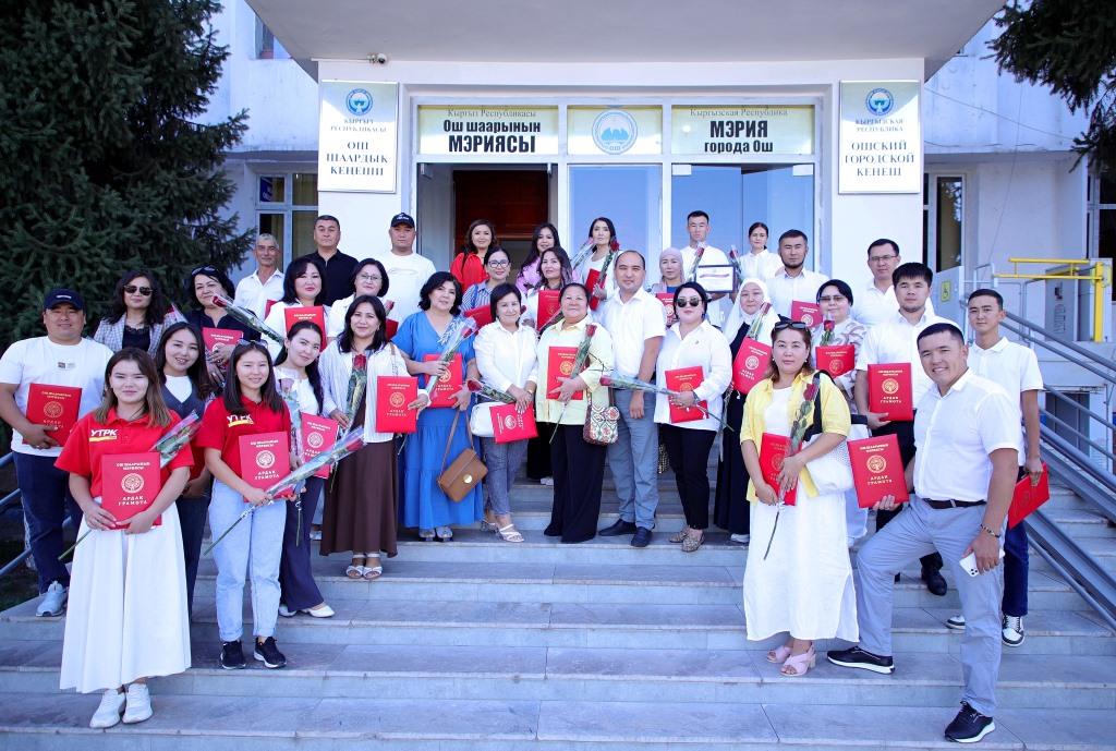 Ош шаарынын социалдык-экономикалык өнүгүүсүнө салым кошкон, шаардын коомдук-саясий турмушуна активдүү катышкан ар тармактын кызматкерлери 31-август Кыргыз Республикасынын көз карандысыздыгынын 33 жылдыгына карата Ош шаарынын мэриясынын Ардак грамотасы жана ыраазычылык баракчалары менен сыйланышты.