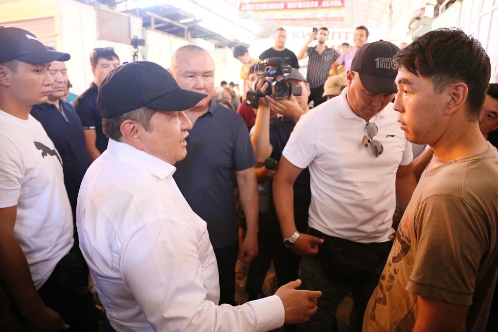 Акылбек Жапаров Жаңы-Маала айылындагы Ахмаджан-Ата көчөсүн, борбордук базарды, А.Навои атындагы эс алуу жайды, ошондой эле Кара-Сымак жана Бодур-Таш айылдарын кыдырып, жеринде шаар тургундарооы, базардын соодагерлери менен сүйлөшүп, суроолоруна жооп берди.
