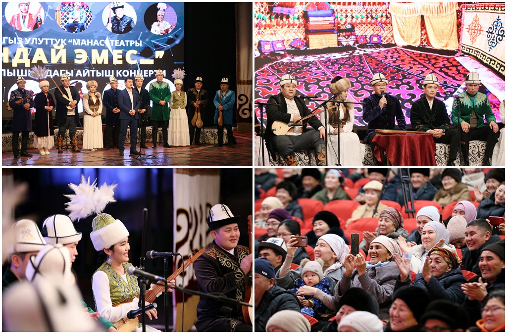 Концертте акындардын айтышы, комуз күүлөрү, залкарлардын термелери жаңырып, обондуу ырлары аткарылып, көрүүчүлөрдүн жарпын жазды.