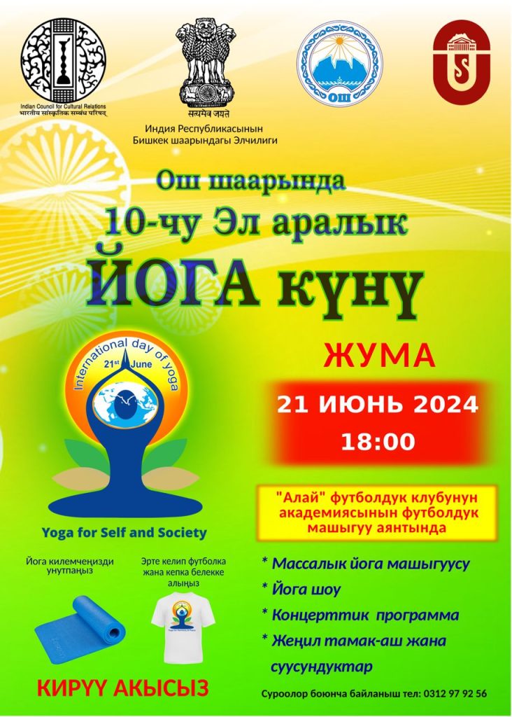 21-июнь күнү, «Алай» ФК академиясынын машыгуу талаасында эл аралык йога күнүнө карата саат 18:00дө иш-чара өтөт.
