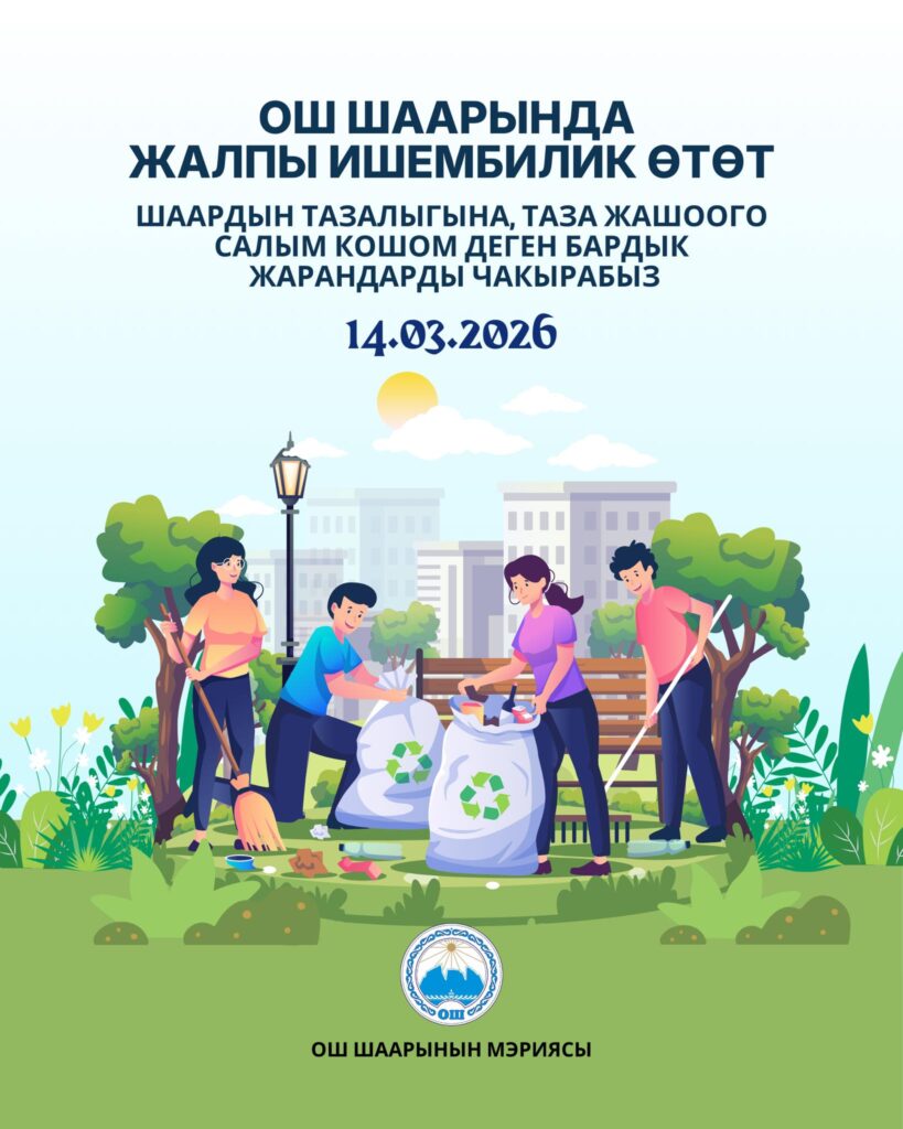 🔹 Эртең, 14-март Ош шаарында жарыяланган жазгы үч айлыктын алкагында шаар аймагында жалпы ишембилик өтөт.
