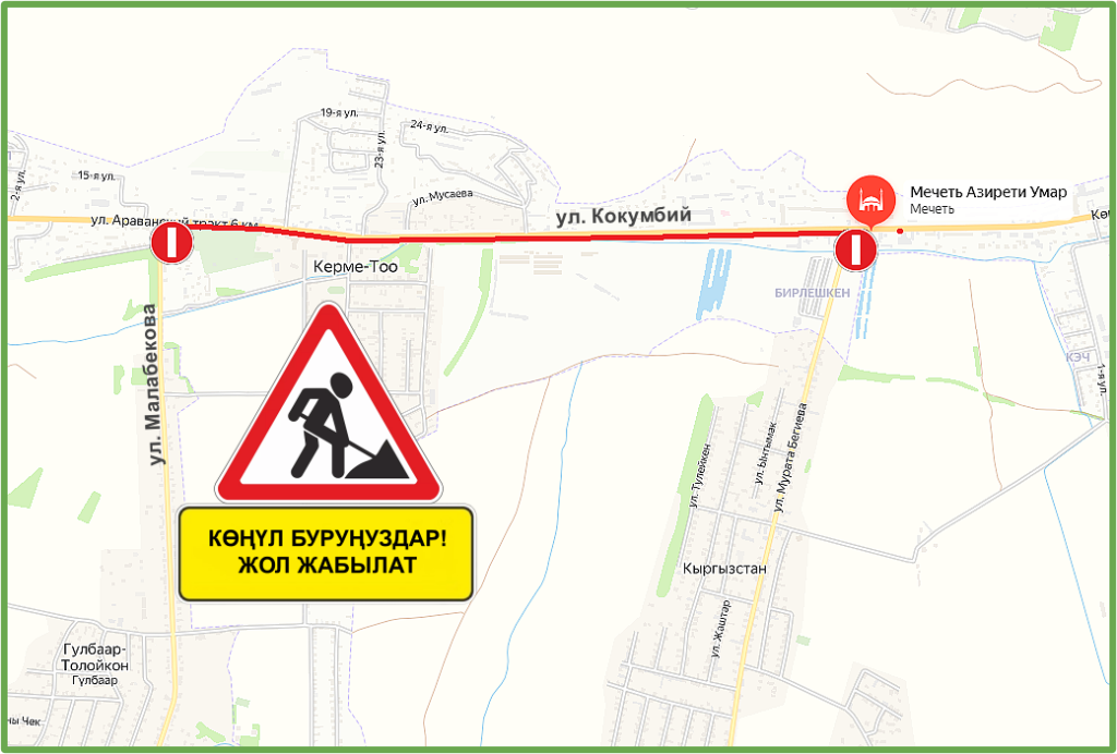 Ош шаарынын Көкүмбий көчөсүн капиталдык оңдоо долбоорун ишке ашыруунун алкагында эртең, 15-октябрдан тарта Мурат Бегиев көчөсүнөн (болжол Азирети Умар мечити) Малабеков көчөсүнө чейинки бөлүгүнүн бир тарабы унаа кыймылы үчүн жабылат.