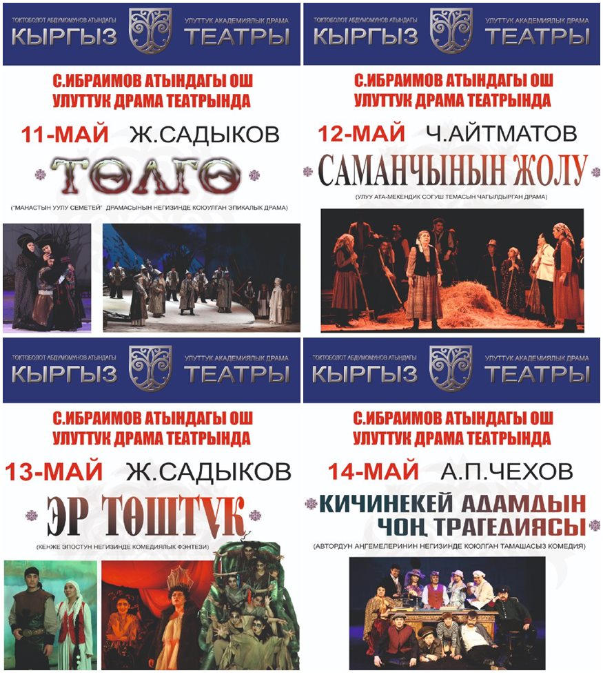 Гастролдук сапардын алкагында чыгармачыл топ Султан Ибраимов атындагы Ош улуттук драма театрында 2024-жылдын 11-15-май күндөрү төмөнкү спектаклдерди тартуулайт.