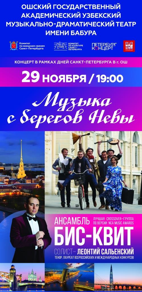 Урматтуу Ош шаарынын тургундары! Санкт-Петербург күндөрүнүн алкагында бүгүн 29-ноябрь күнү, саат 19:00дө Бабур театрында Санкт-Петербургдун «Бис-Квит» камердик оркестри тарабынан «НЕВА ОБОНДОРУ» аталышындагы концерт өтөт. «БИС-КВИТ» (BIS-QUIT