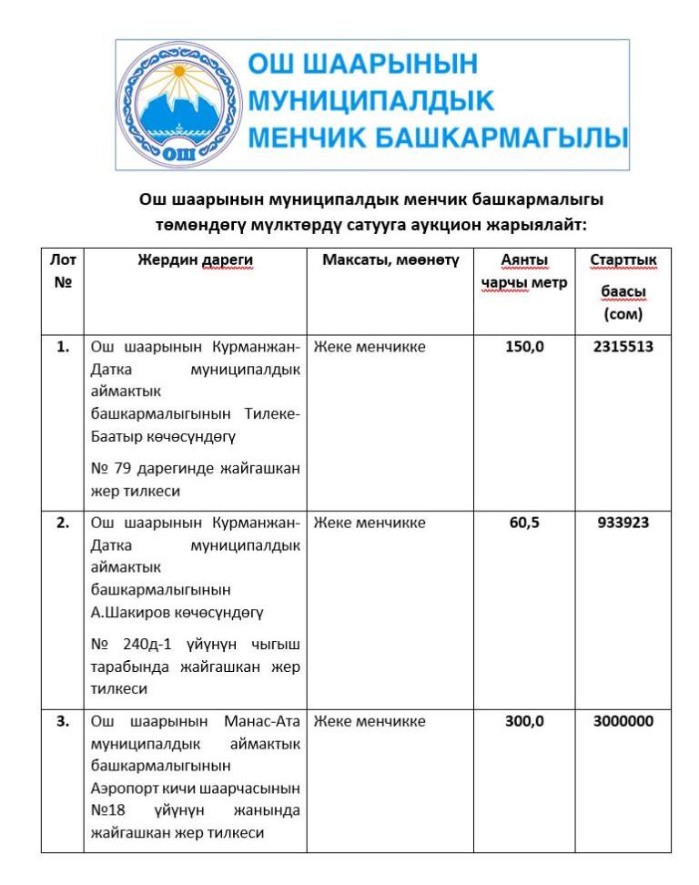 Ош шаарынын муниципалдык менчик башкармалыгынын менчигиндеги мүлктөрдү менчиктештирүү максатында жумушчу комиссия төмөндөгү мүлктөрдү сатууга аукцион жарыялайт