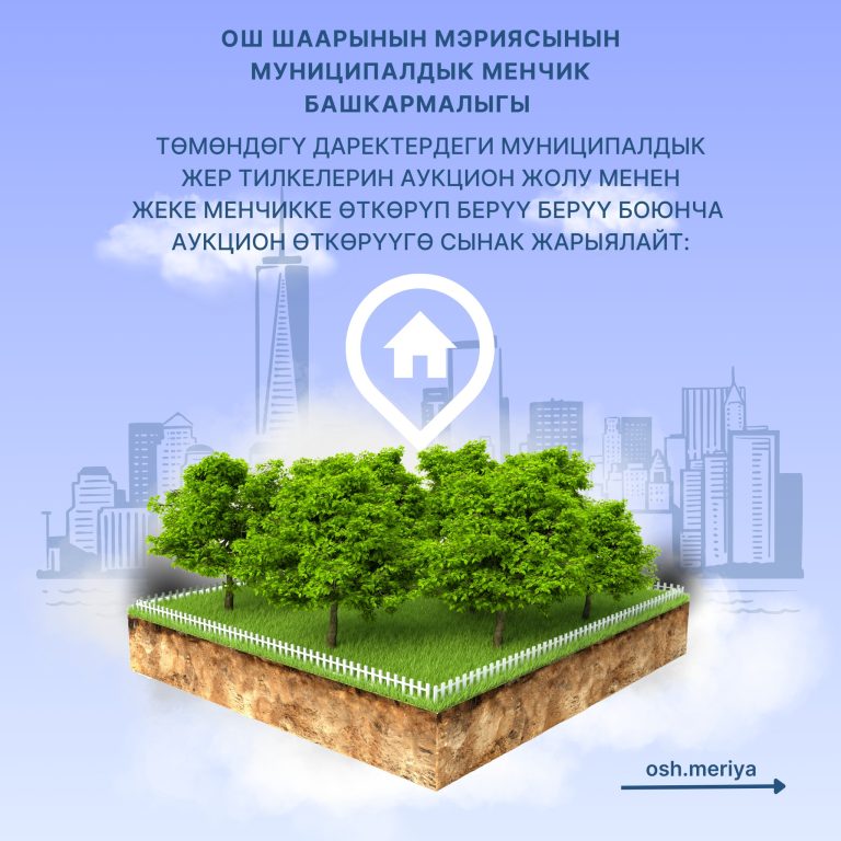 ✅ Ош шаарынын мэриясынын муниципалдык менчик башкармалыгы төмөндөгү даректердеги муниципалдык жер тилкелерин аукцион жолу менен жеке менчикке өткөрүп берүү берүү боюнча аукцион өткөрүүгө сынак жарыялайт: