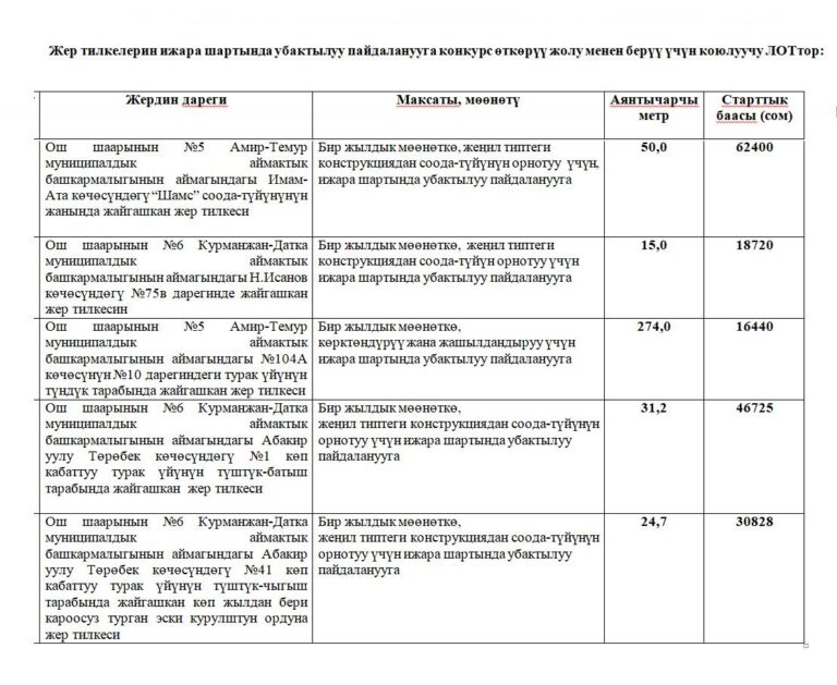 Жер тилкелерин ижара шартында убактылуу пайдаланууга конкурс