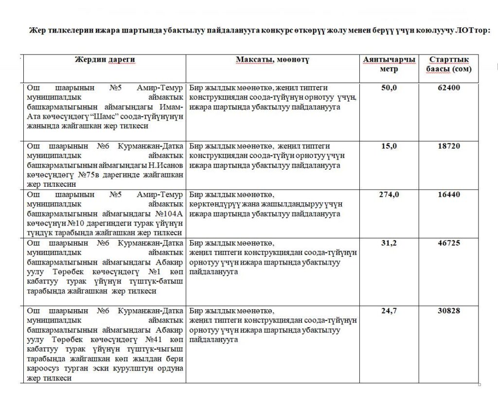 Конкурс өткөрүү күнү “Ош шамы” коомдук саясий гезитине же болбосо Ош шаарынын мэриясынын сайтына жарыя чыккан күндөн баштап 30 күндүк мөөнөт өткөндөн кийин төмөндөгү даректе өткөрүлөт: Ош шаары, Заднепровский көчөсү №4, Ош шаарынын муниципалдык менчик башкармалыгынын имараты.