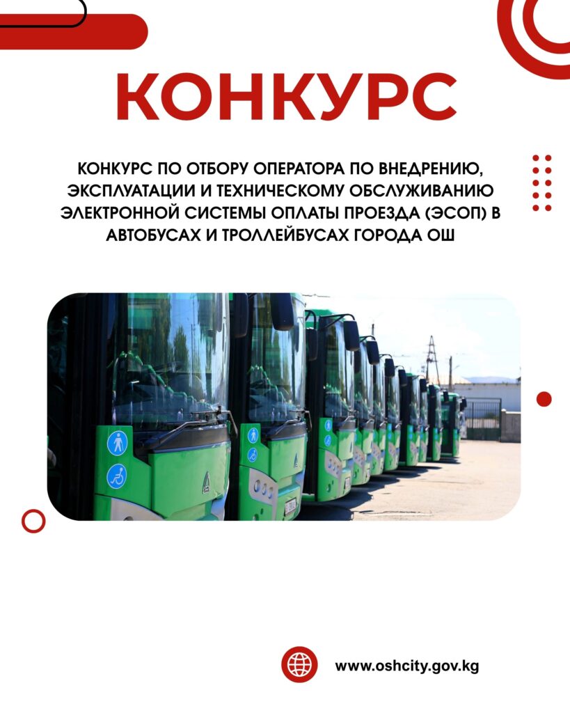 КОНКУРСНАЯ ДОКУМЕНТАЦИЯ по отбору Оператора по внедрению, эксплуатации и техническому обслуживанию Электронной системы оплаты проезда (ЭСОП) в автобусах и троллейбусах города Ош Введение Проект по внедрению и эксплуатации Электронной системы оплаты проезда (ЭСОП) в общественном транспорте города Ош направлен на повышение качества, прозрачности и эффективности пассажирских перевозок. Реализация проекта позволит перейти от устаревших форм наличных […]