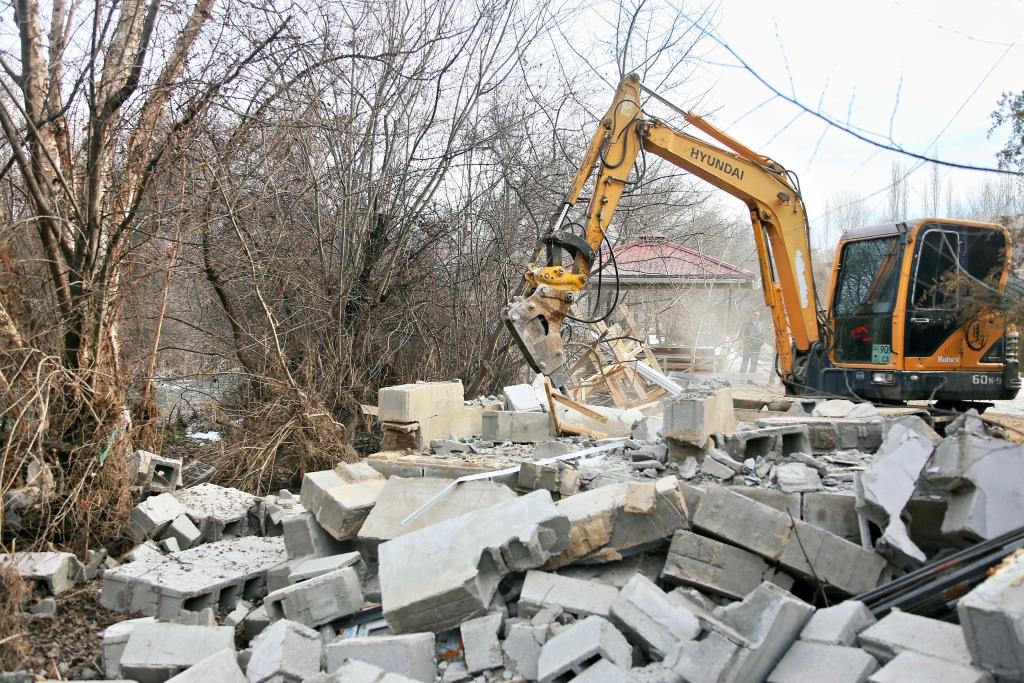 Управление муниципальной собственности г.Ош проводит демонтаж незаконных объектов, в том числе зон отдыха, находящихся в водоохранной зоне реки Ак-Буура села Толойкон.