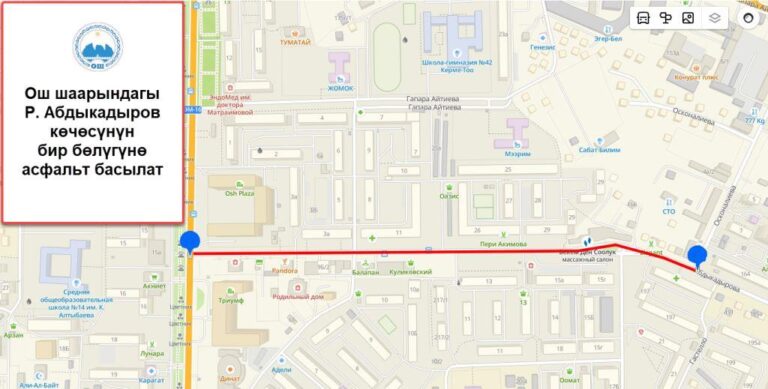 Согласно поручению мэра города Ош Бакытбека Жетигенова в текущем году запланирована работа по асфальтированию учаcтка улицы Абдыкадырова от пересечения с улицей Осконалиева до улицы Б.