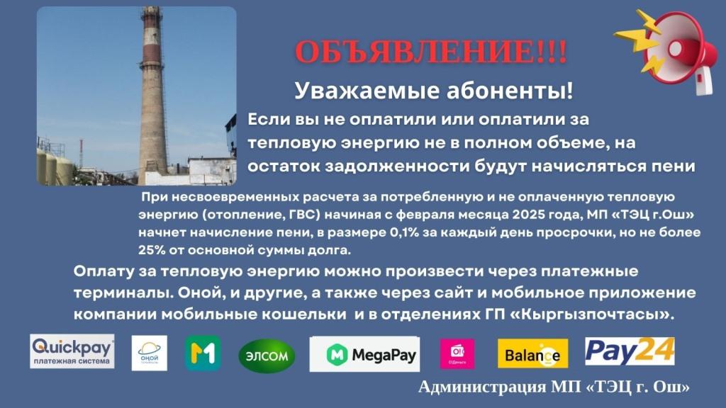 МП «ТЭЦ г.Ош» при несвоевременных расчета за потребленную и не оплаченную тепловую энергию (отопление, ГВС) начиная с февраля месяца 2025 года, начнет начисление пени, в размере 0,1% за каждый день просрочки, но не более 25% от основной суммы долга.