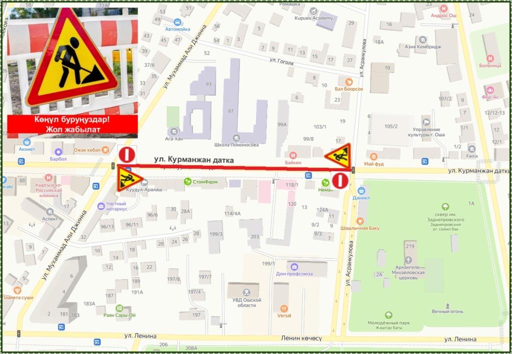 ТЭЦ города Ош сообщает, что для проведения работ по замене теплосетей с завтрашнего дня будет закрыт проезд для транспортных средств на участке улицы Курманжан датка от пересечения с улицей Асранкулова (ориентир РСК банк) до пересечения с улицей Мухаммед Али Джиннах (ориентир школа Ага Хана).